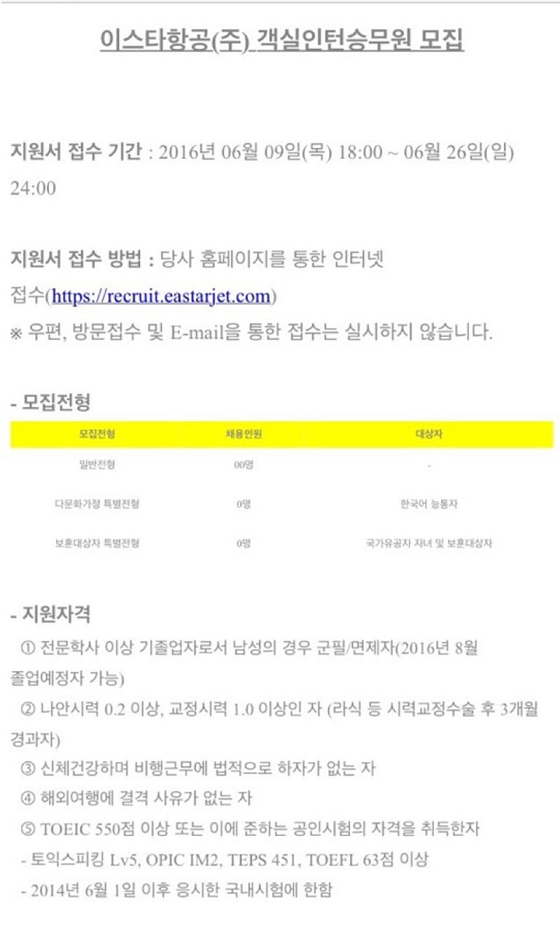 2016 이스타항공 객실 인턴 승무원 채용 모집