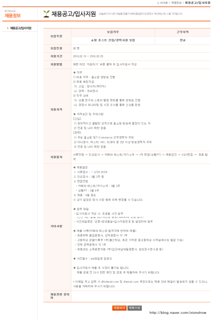 이전글 다음글 목록 작성일작성일 : 2016-02-15 2016 NS홈쇼핑 쇼핑호스트 공채 OPEN! 본문 2016 NS홈쇼핑 쇼핑호스트 공채 소식! 2016년에도 로엘인들의 합격을 위해 최선을 다하겠습니다. 로엘의 자랑! 공채프로젝트가 곧 공개됩니다. 댓글목록 등록된 댓글이 없습니다. 이전글 다음글 목록