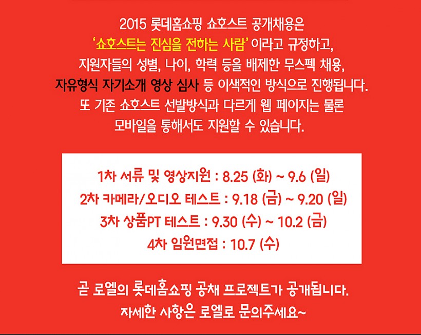 이전글 다음글 목록 작성일작성일 : 2015-08-19 2015 롯데홈쇼핑 쇼호스트 공채 본문 2015 롯데홈쇼핑 쇼호스트 공채가 25일부터 시작됩니다. 로엘의 자랑! 매번 공채 때마다 실시되는 로엘 공채 프로젝트! 로엘의 2015 롯데홈쇼핑 쇼호스트 공채 프로젝트는 8월 24일 21시에 공개됩니다. 댓글목록 등록된 댓글이 없습니다. 이전글 다음글 목록