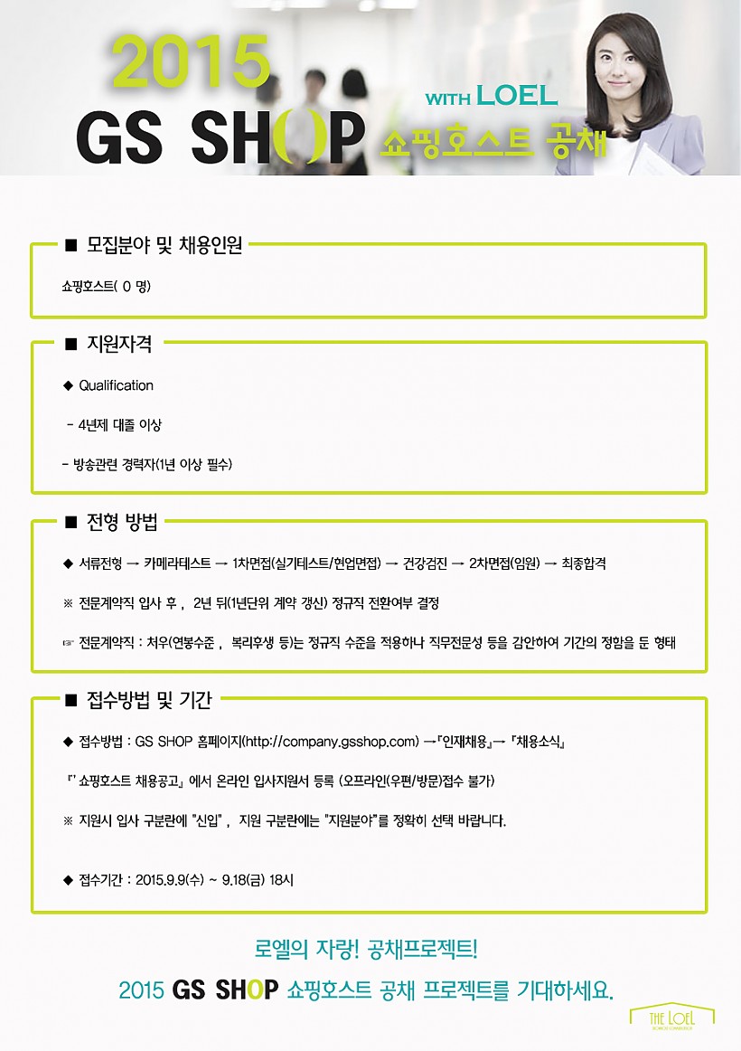 이전글 다음글 목록 작성일작성일 : 2015-09-04 2015 GS홈쇼핑 쇼핑호스트 공개채용이 시작됩니다 본문 2015 GS SHOP 쇼핑호스트 공채! 이번에도 로엘입니다. 댓글목록 등록된 댓글이 없습니다. 이전글 다음글 목록