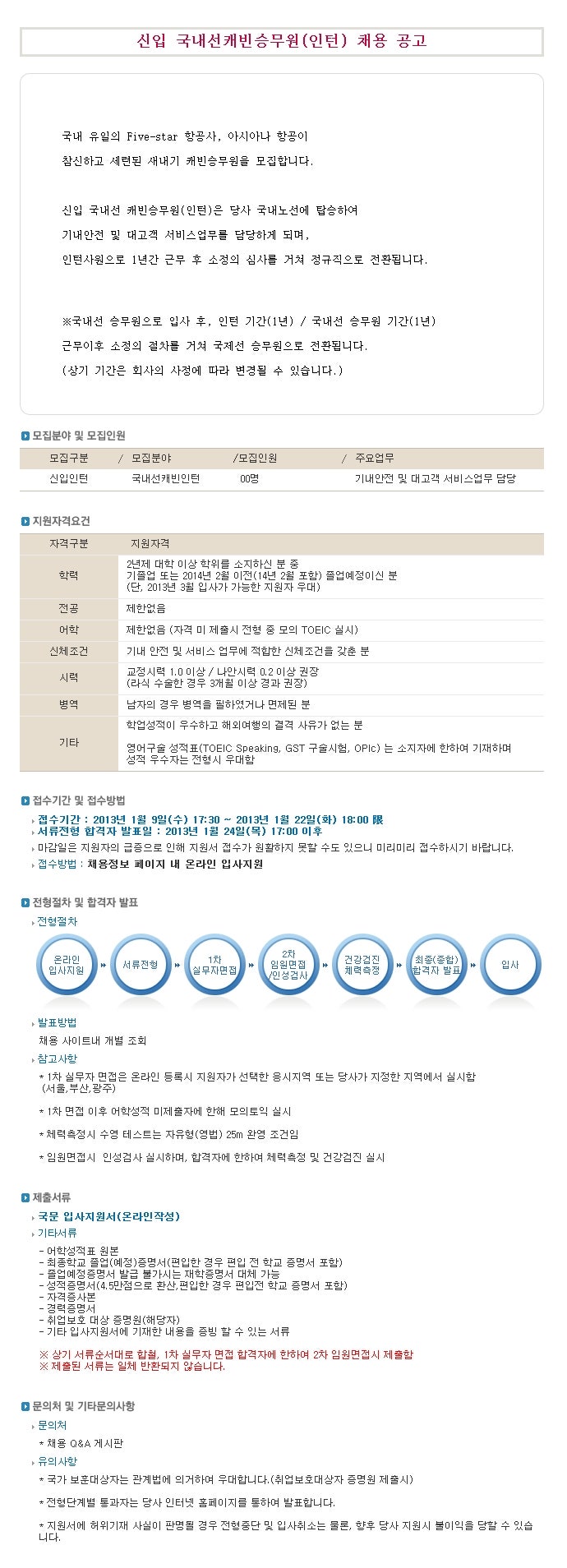 2013 아시아나항공 국내선 캐빈승무원 채용