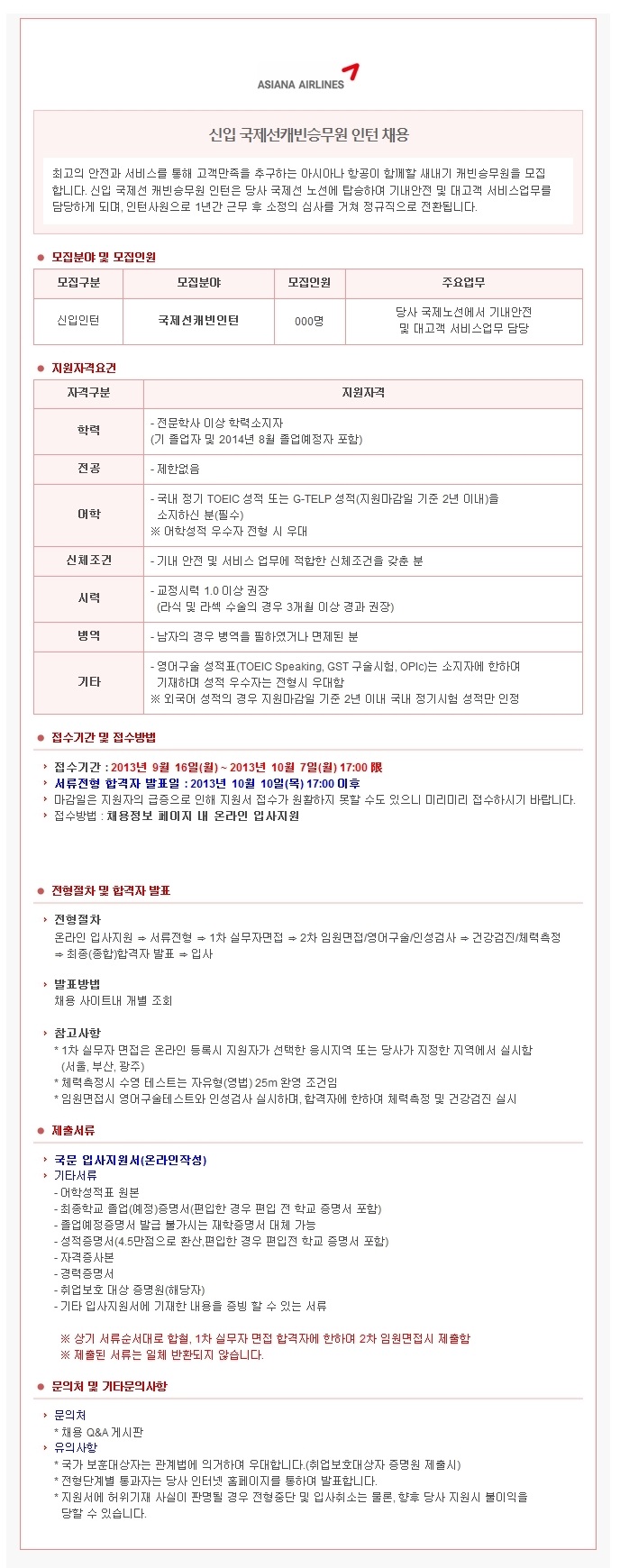 2013 아시아나항공 국제선 캐빈승무원 채용