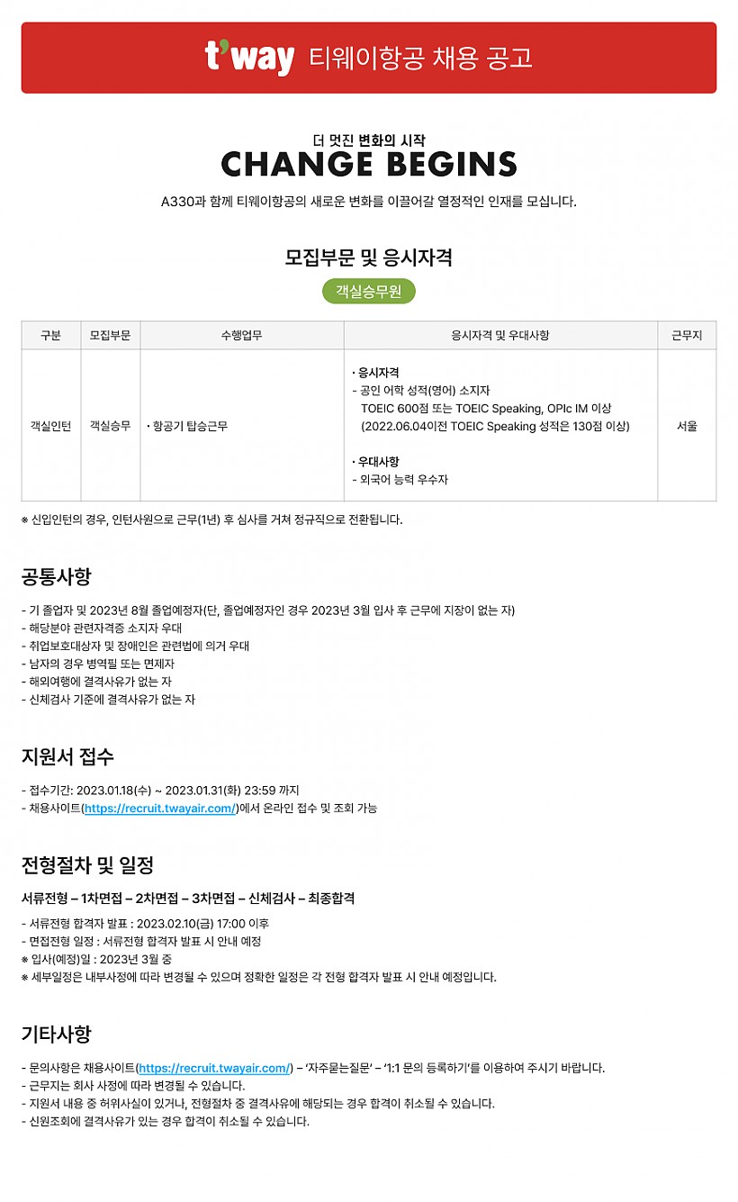 2023 티웨이항공 객실승무원 공개채용