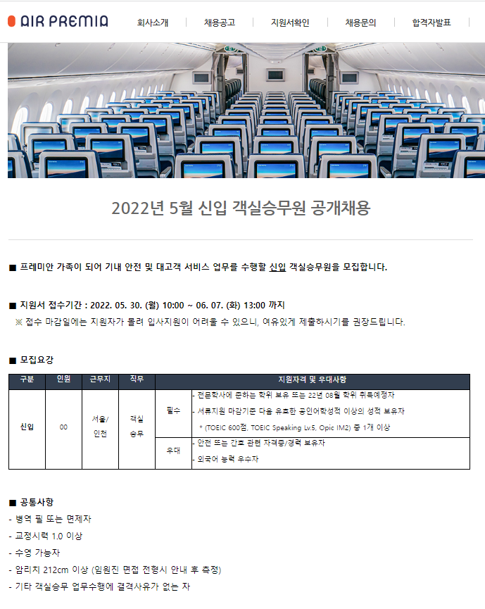 2022 에어프레미아 신입 객실승무원 공개채용