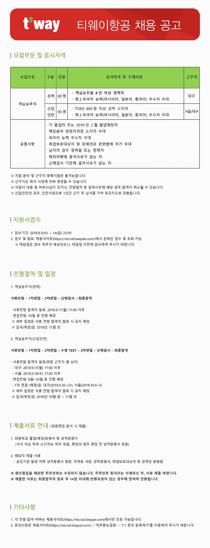 2018 티웨이항공 객실승무원 채용 공고