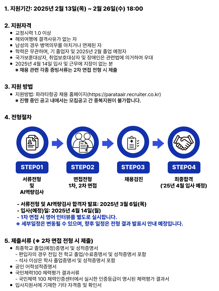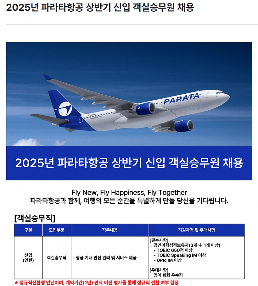 2025 상반기 파라타항공 신입 객실 승무원 채용