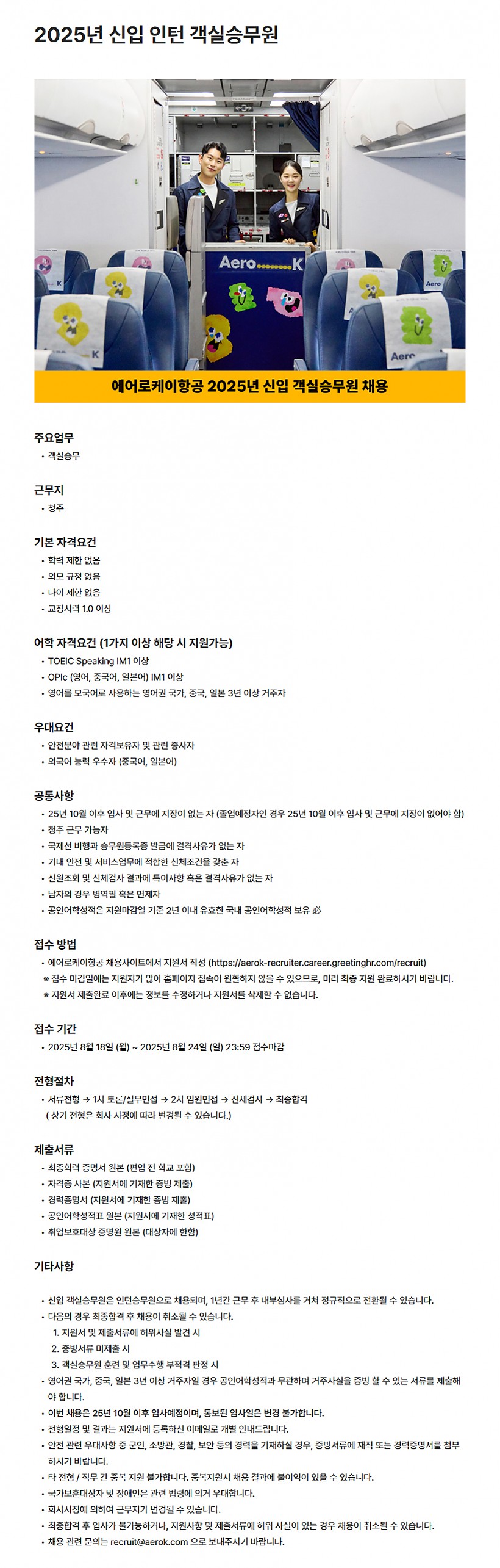2025 에어로케이항공 신입 인턴 객실승무원 채용